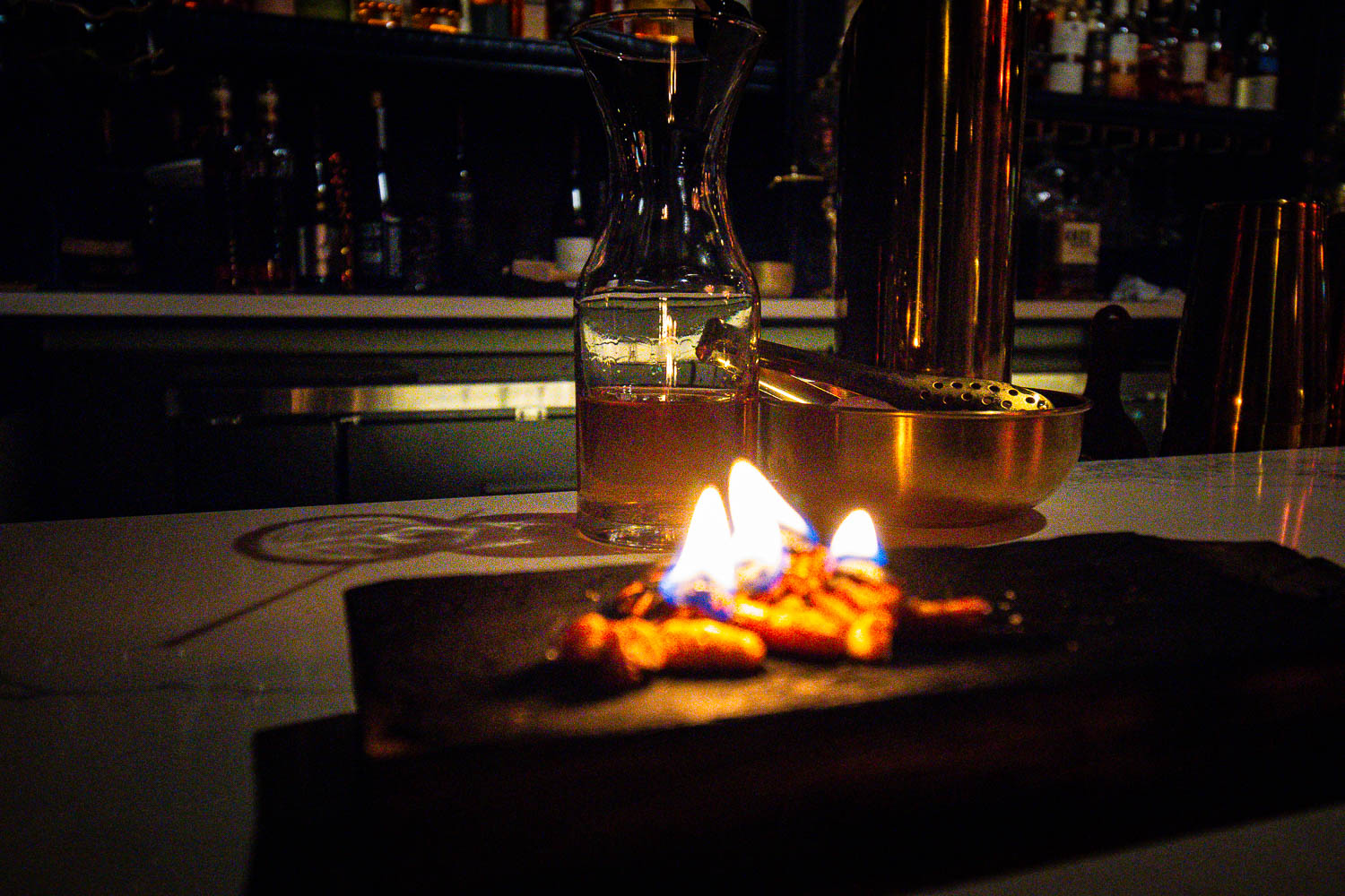 DILLINGER – Described as “Gatlinburg’s most famous cocktail got a new venue and a more gangster name”. The version we ordered: Heaven’s Door Revival Tennessee Straight Bourbon, Madagascar vanilla bean simple syrup, Peychaud’s Bitters, and black-cherry ice spheres. Then the theatre: pecans ignited on a bourbon-barrel stave right at our table, with smoke swirling around the glass. The flavor? Sweet vanilla, black cherry, and a lingering toasted pecan-smoke finish.