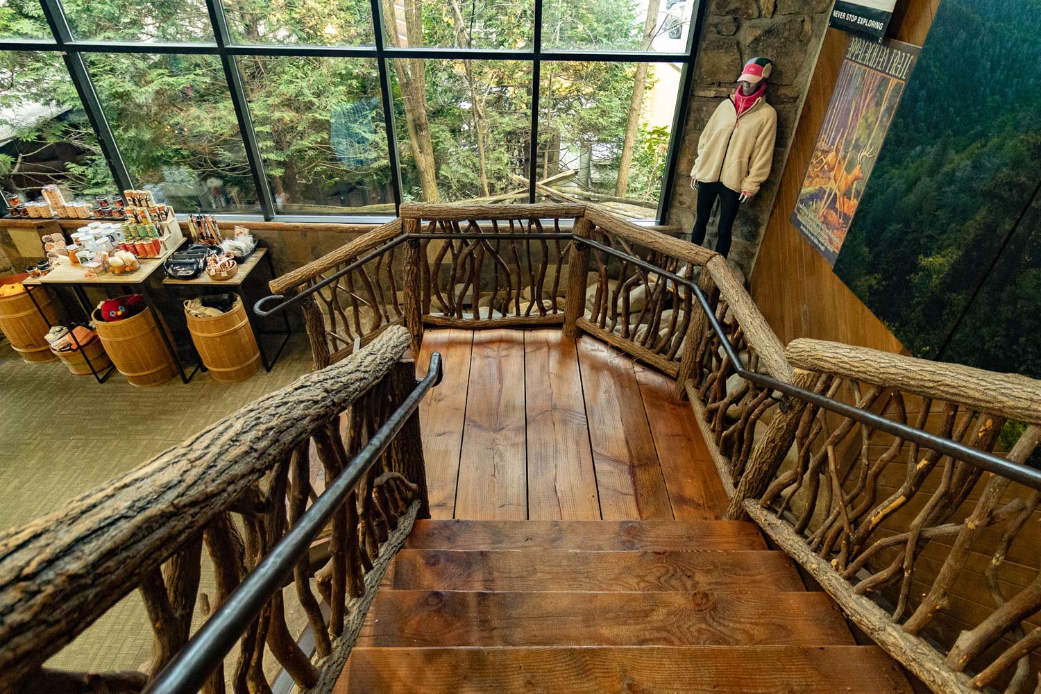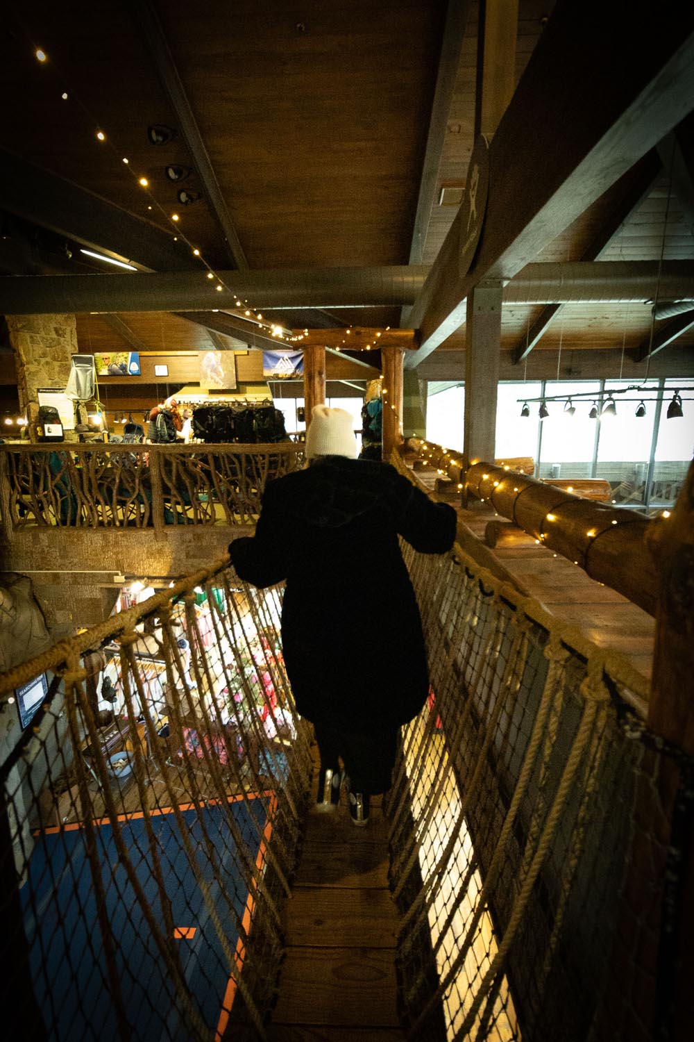 What really sets this place apart is how immersive it feels. Wander past rows of backpacks and trail boots and suddenly you’re face to face with a swinging rope bridge suspended on the second floor – and yes, you can walk across it just for fun. Kids gravitate toward it, but adults love it too. It’s one of those joyful, unplanned moments that turns a shopping stop into an experience.